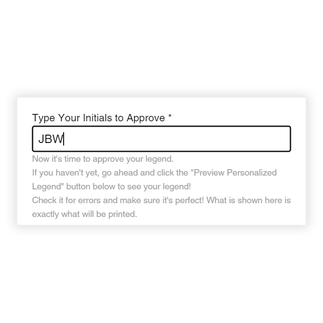 Or is it John? Whatever the case, once you're happy with your legend, please type your initials into the provided box to signify that you approve it to be printed. Note that reprint requests are possible before your map ships, but there will be an associated fee.